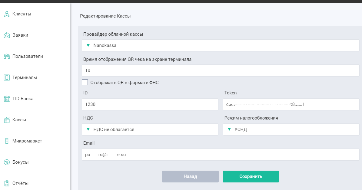 Чтобы отобразить QR-коды чеков за наличные и безналичные продажи на экране терминала, необходимо заключить договор с провайдером облачной кассы и выполнить интеграцию. В разделе терминалы (Терминалы-карандаш) нужно поставить галочки Отправлять наличные/безналичные продажи - эта настройка отвечает за формирование пакетов продаж и отправку данных по ним в кассу. В личном кабинете портала доступна интеграция с несколькими онлайн-кассами на выбор: