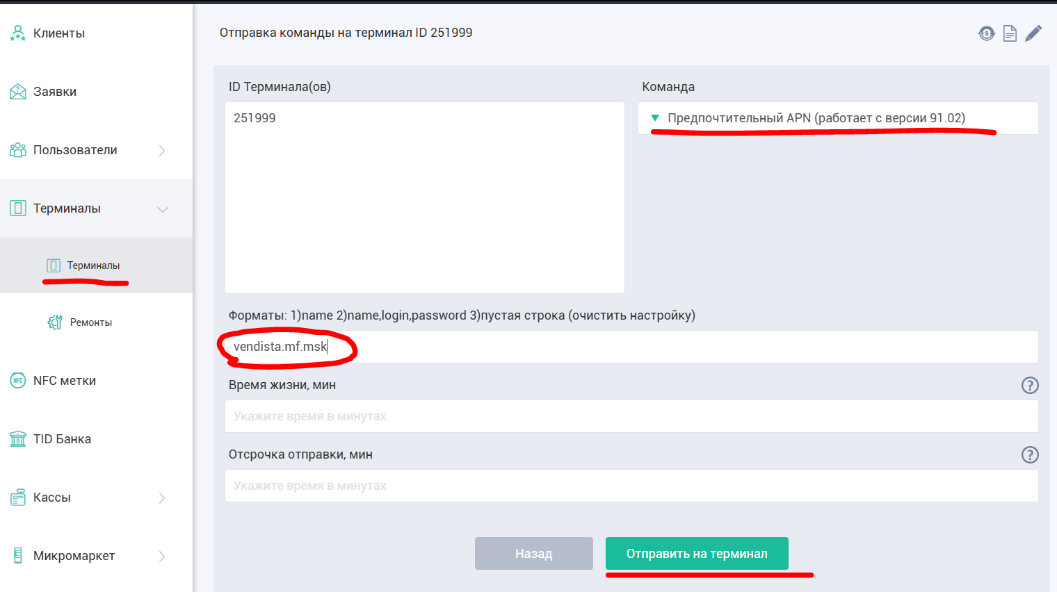 4. Отправить команду “Предпочтительный APN”с параметром строки: