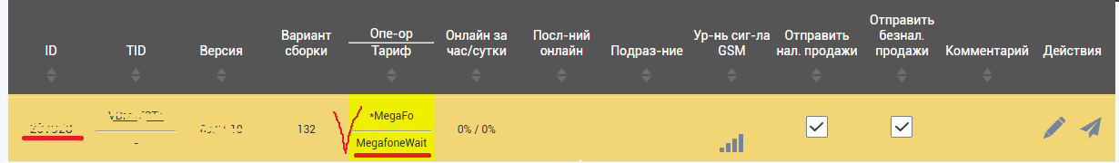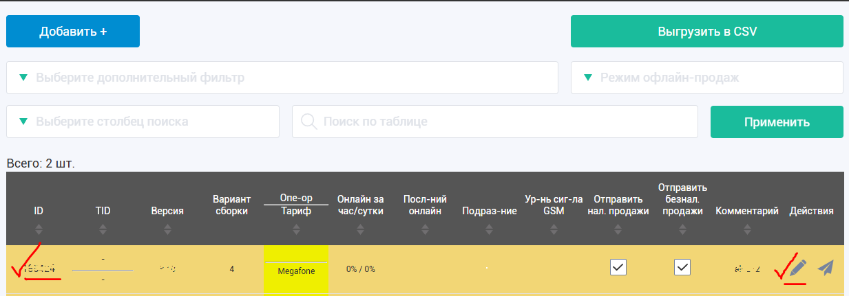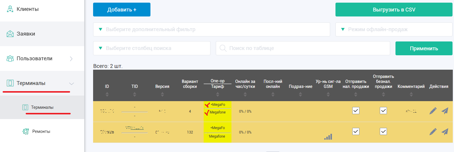 2. Перейти в меню Терминалы и найти терминал, который в меню Оператор подсвечивается желтым цветом и у которого оператор связи Мегафон и установленный тариф Megafone или Megafone3