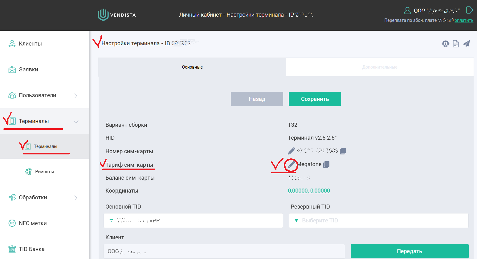 3.2.3. Перевести можно только сим-карты Мегафон, которые поставлялись предустановленные в терминал компанией «Vendista».