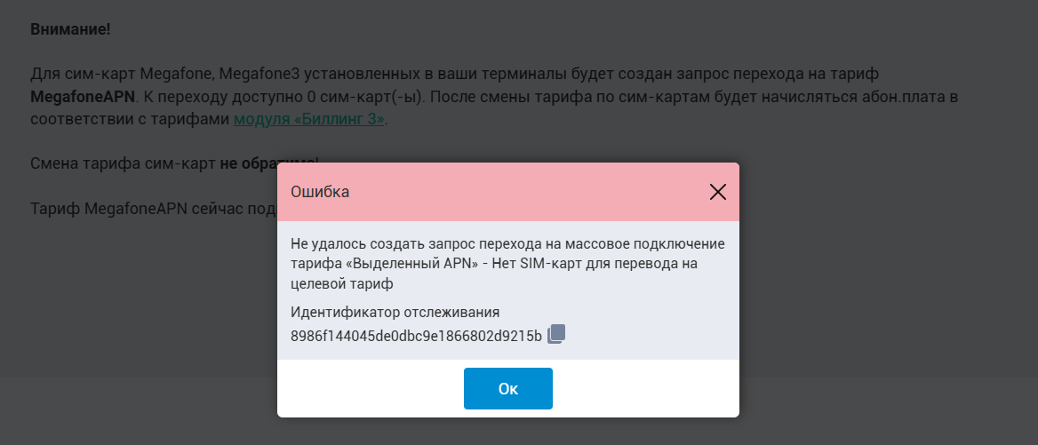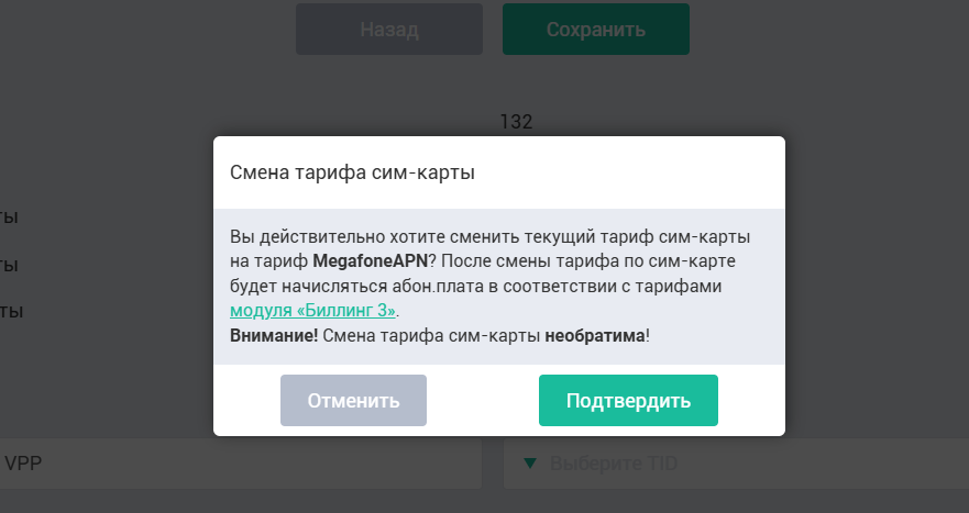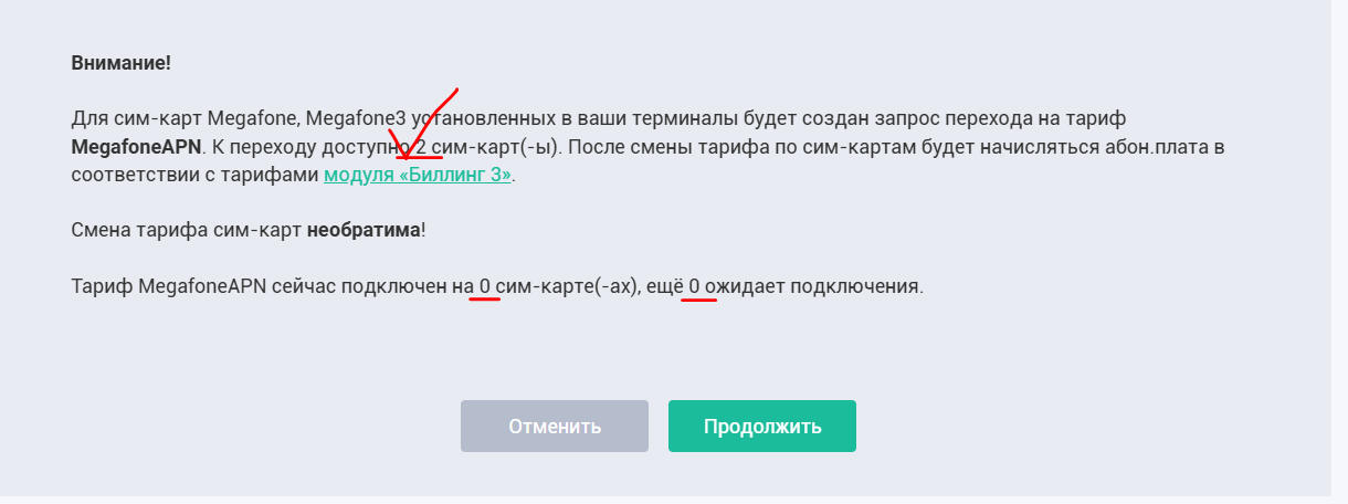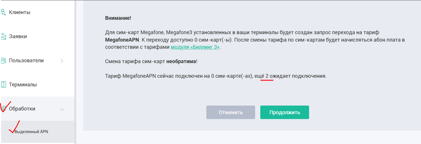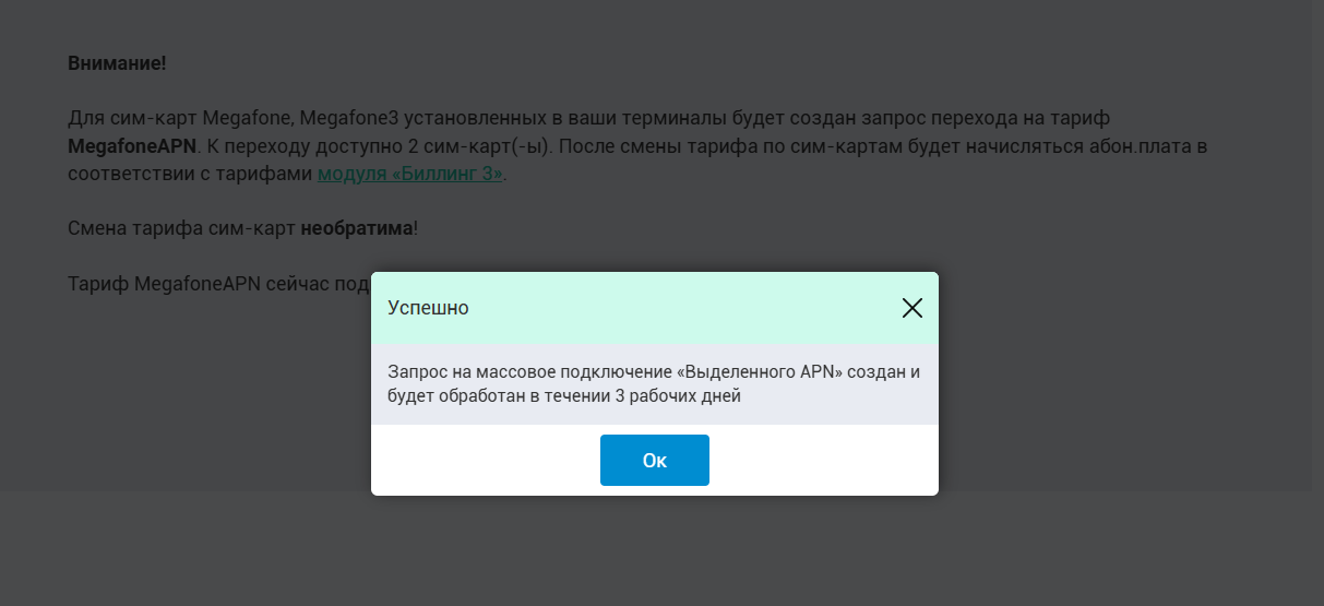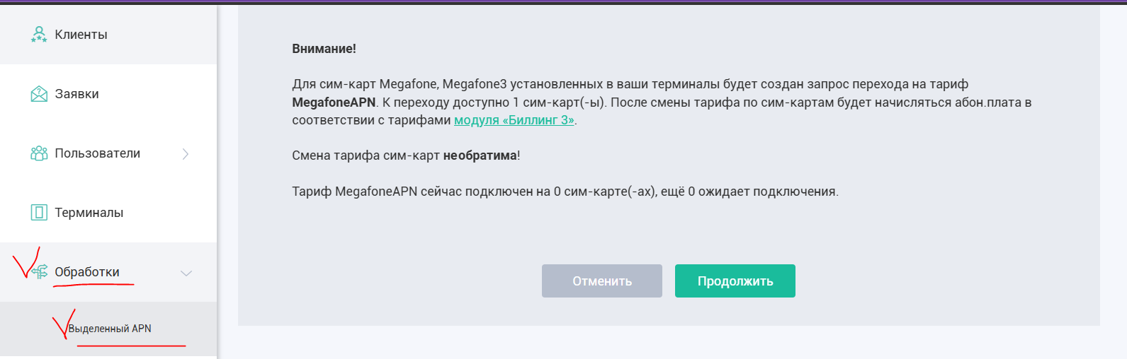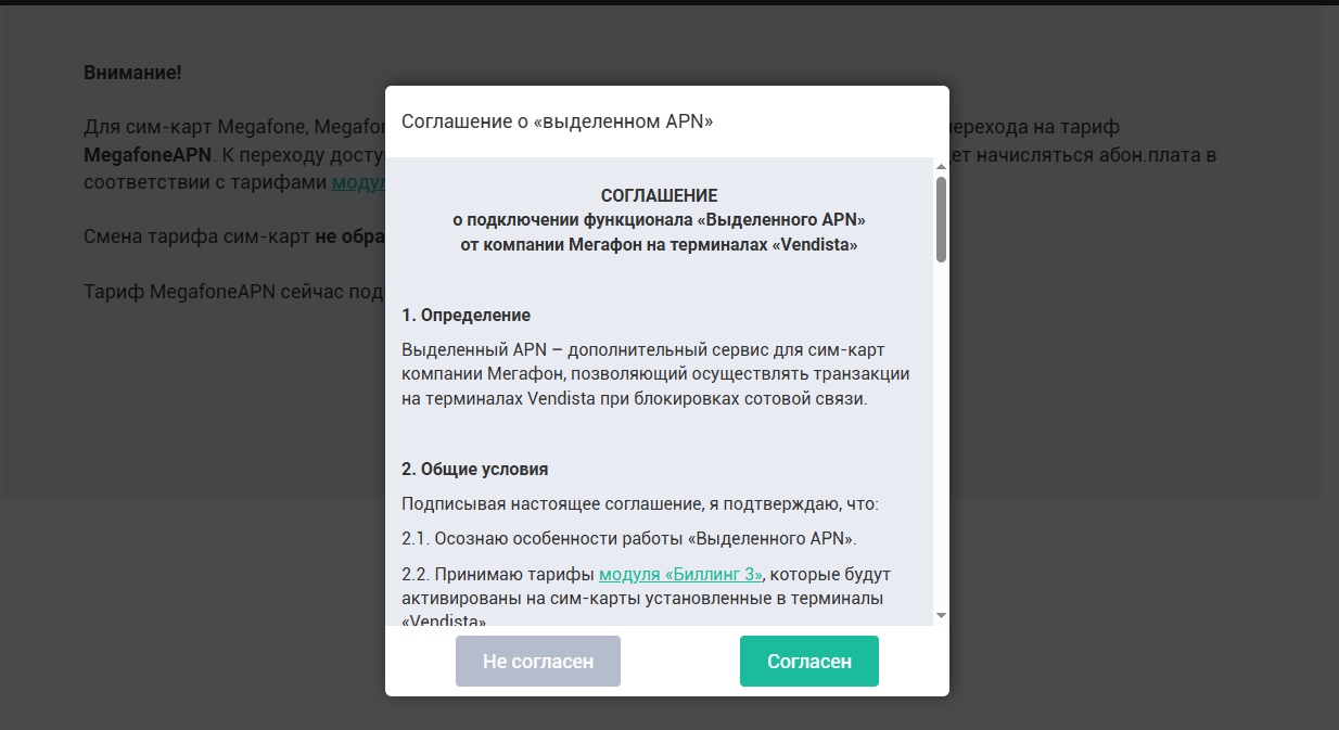 Важно помнить! Перевести на выделенный APN возможно только сим-карту Мегафон (с тарифом Megafone или Megafone3), которая была куплена вместе с терминалом. При этом меняется тариф обслуживания для клиентов на «Модуль Биллинга 3», Вернуть обратно сим-карту на старый тариф при этом будет НЕВОЗМОЖНО.