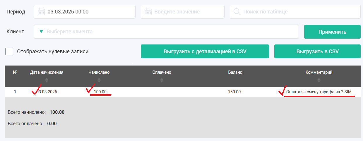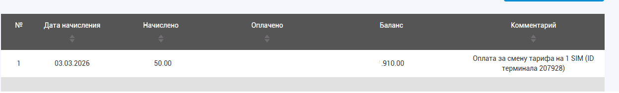 8. В личном кабинете в разделе Абонплата вы можете увидеть что вам, была начислена абонплата за перевод на новый тариф за каждую из переводимых сим-карт (в данном примере за перевод двух сим-карт)