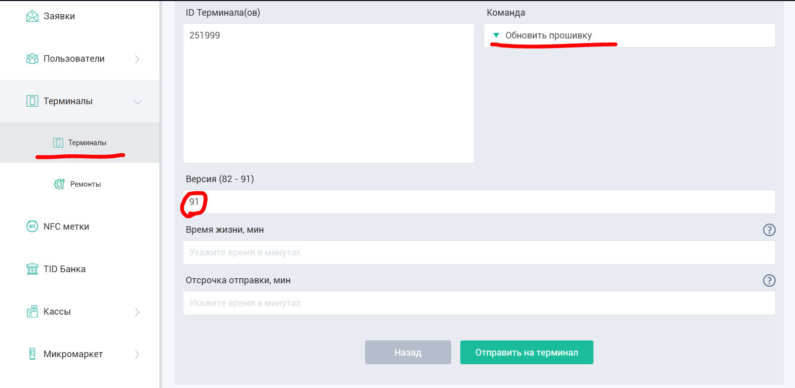 4. Обновите прошивку терминала до версии не ниже 91.02, отправив соответствующую команду на терминалы. Проверьте обновилась ли прошивка терминала до соответствующей.