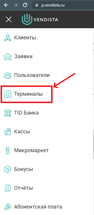 - перейти в раздел «Терминалы» портала https://p.vendista.ru.