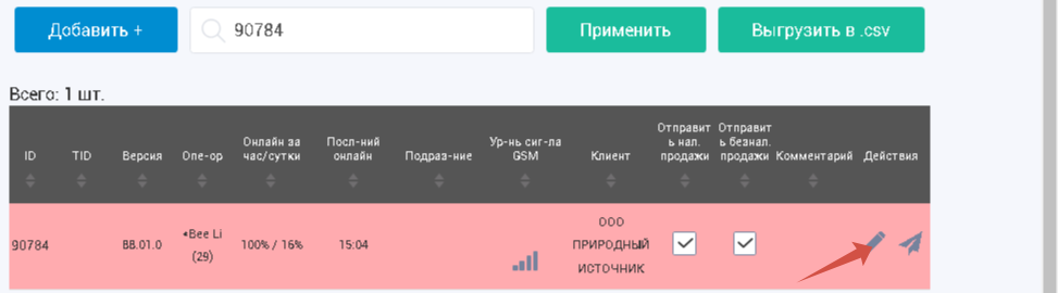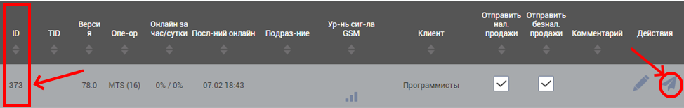 - в первом столбце «ID» открывшейся таблице найти искомый номер терминала и нажать на значок «Самолетик»