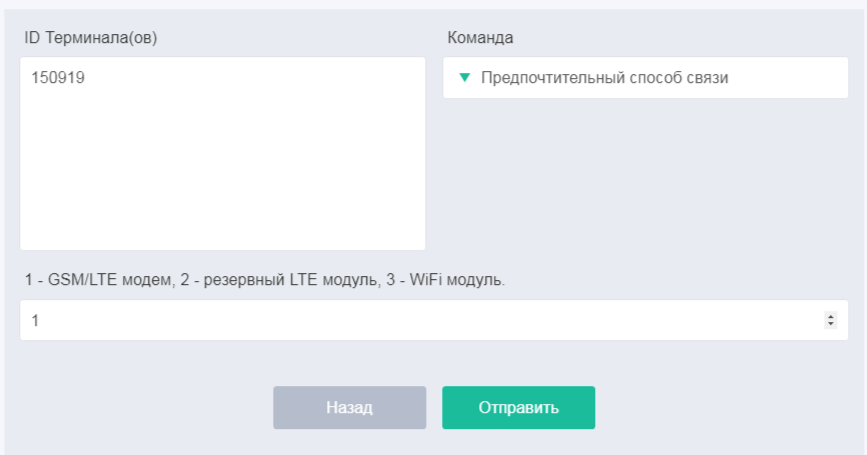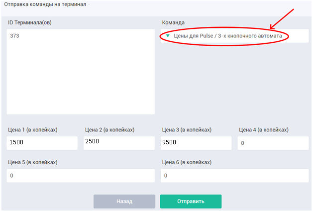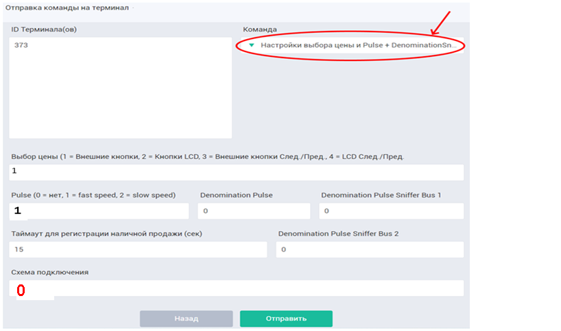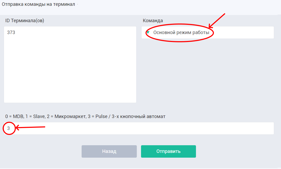- в открывшемся окне выбрать команду «Основной режим работы» и в появившейся строке «Параметр» указать «3», что означает выбор режима «Pulse» и нажать кнопку «Отправить».