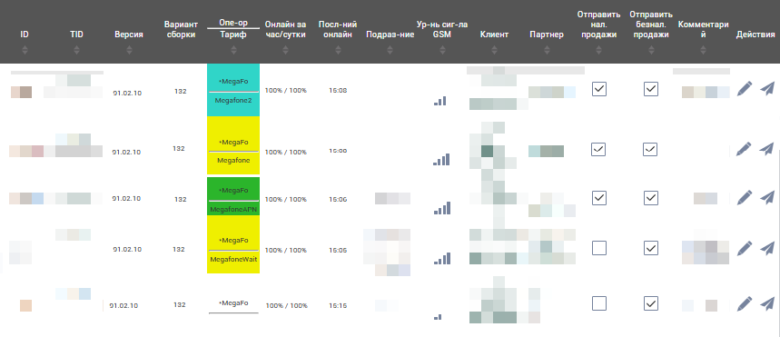 Зелёный цвет (оператор) - Sim-карта от Vendista. Обозначаются sim-карты от Vendista, с тарифным планом MegafoneAPN, которые обслуживаются по тарифу модуля “Биллинг 3”
