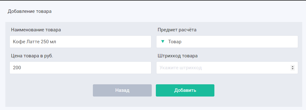 2. Заполните поля Наименование товара, Предмет расчета, Цена товара в руб. Штрих код товара заполнять не обязательно. Нажмите кнопку Добавить.