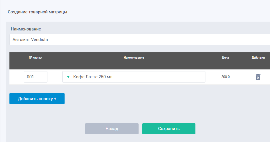 3. После добавления всех товарных позиций, создайте товарную матрицу для своего автомата в разделе Кассы – Товарные матрицы, по ссылке https://p.vendista.ru/ProductMatrices . Для этого нажмите кнопку Добавить +, заполните поле Наименование и привяжите к товарным позициям, соответствующие номера кнопок автомата, нажмите Сохранить.