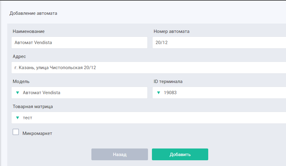 4. В разделе Кассы – Автоматы нажмите кнопку Добавить + Заполните значения полей: Наименование, Номер автомата, Адрес, Модель, ID Терминала.