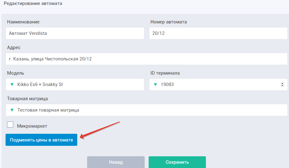 5. После добавления автомата вернитесь на страницу настроек созданного автомата и нажмите кнопку Подменять цены в автомате и Сохранить. Теперь терминал будет брать цену не из автомата, а из данной товарной матрицы